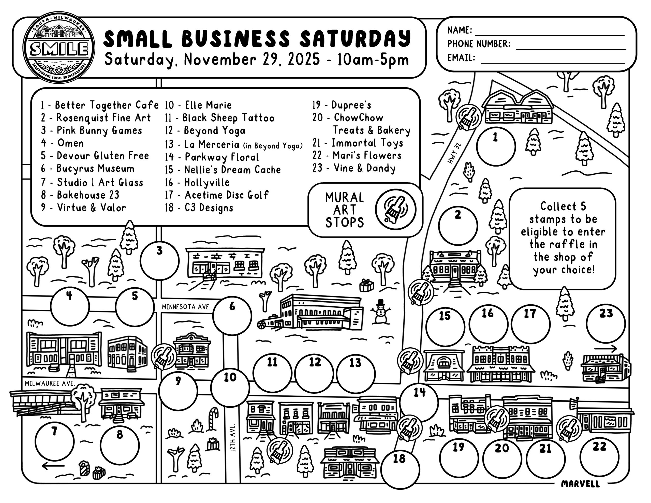 Shop 20+ Small Businesses in South Milwaukee from 10am-5pm on Small Business Saturday, November 29th, 2025.